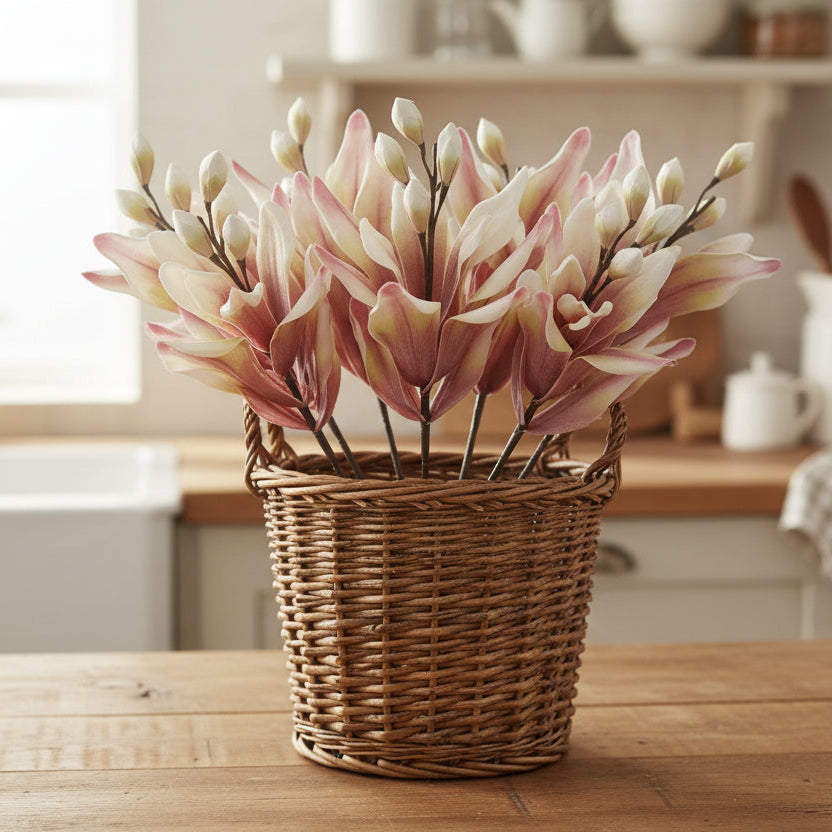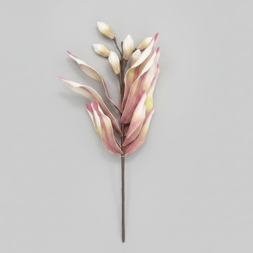 The Dimitri Pink Flower captures a quintessential spring aesthetic through its vibrant budding blossoms and lush pink foliage. This versatile botanical serves as an elegant standalone piece or a refined accent for multidimensional floral arrangements. Each stem and leaf features an integrated wire core, providing the flexibility needed for effortless, custom styling.