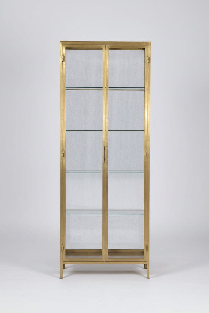 Solid iron frame finished in radiant brass creates a refined, structured profile. Clear glass front, sides, and interior shelves provide open visibility for display. Vertical proportions and mixed materials introduce contrast between transparency and metallic warmth. Includes anti tip hardware for secure installation and stability.