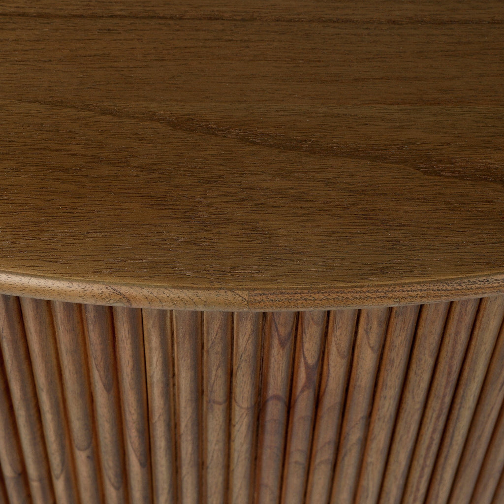 Warm natural oak defines this oval coffee table, featuring a smooth, rounded top paired with a richly fluted apron that wraps the entire silhouette. Subtle bullnose edging and a grounded base lend depth and craftsmanship, creating a timeless piece that balances softness, texture, and architectural presence.