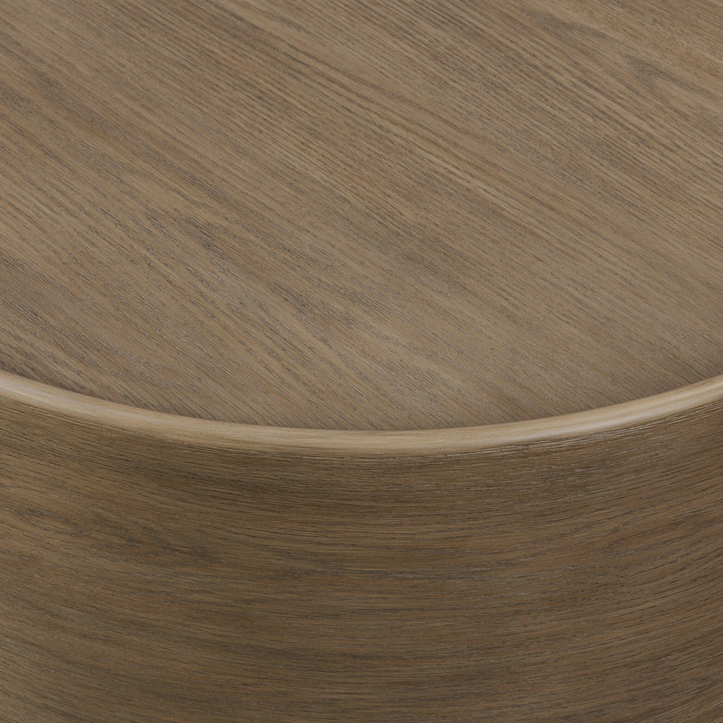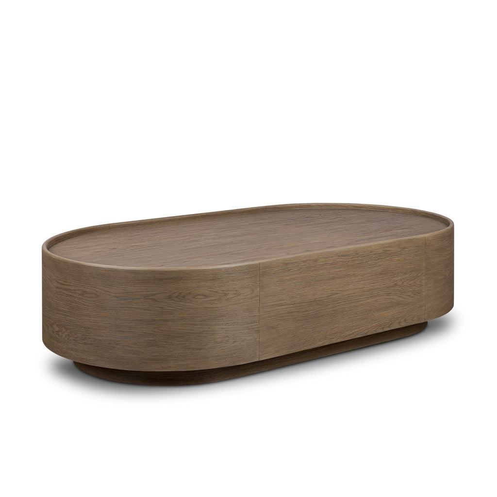 Warm natural oak shapes this oval coffee table, bringing a sense of softness through its gently rounded bullnose edging. The integrated tray-style top adds subtle dimension and function while maintaining a clean, refined profile.