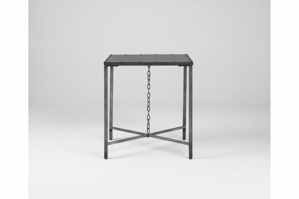 Substantial metal frame with a streamlined profile accented by nailhead and chain link detailing. Layered metal elements introduce industrial character while maintaining structural refinement. Bold construction delivers a strong accent presence within the space.