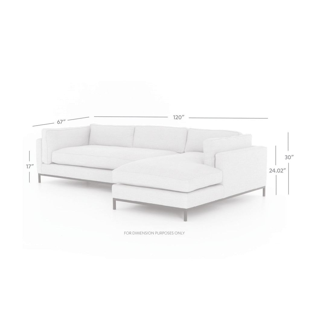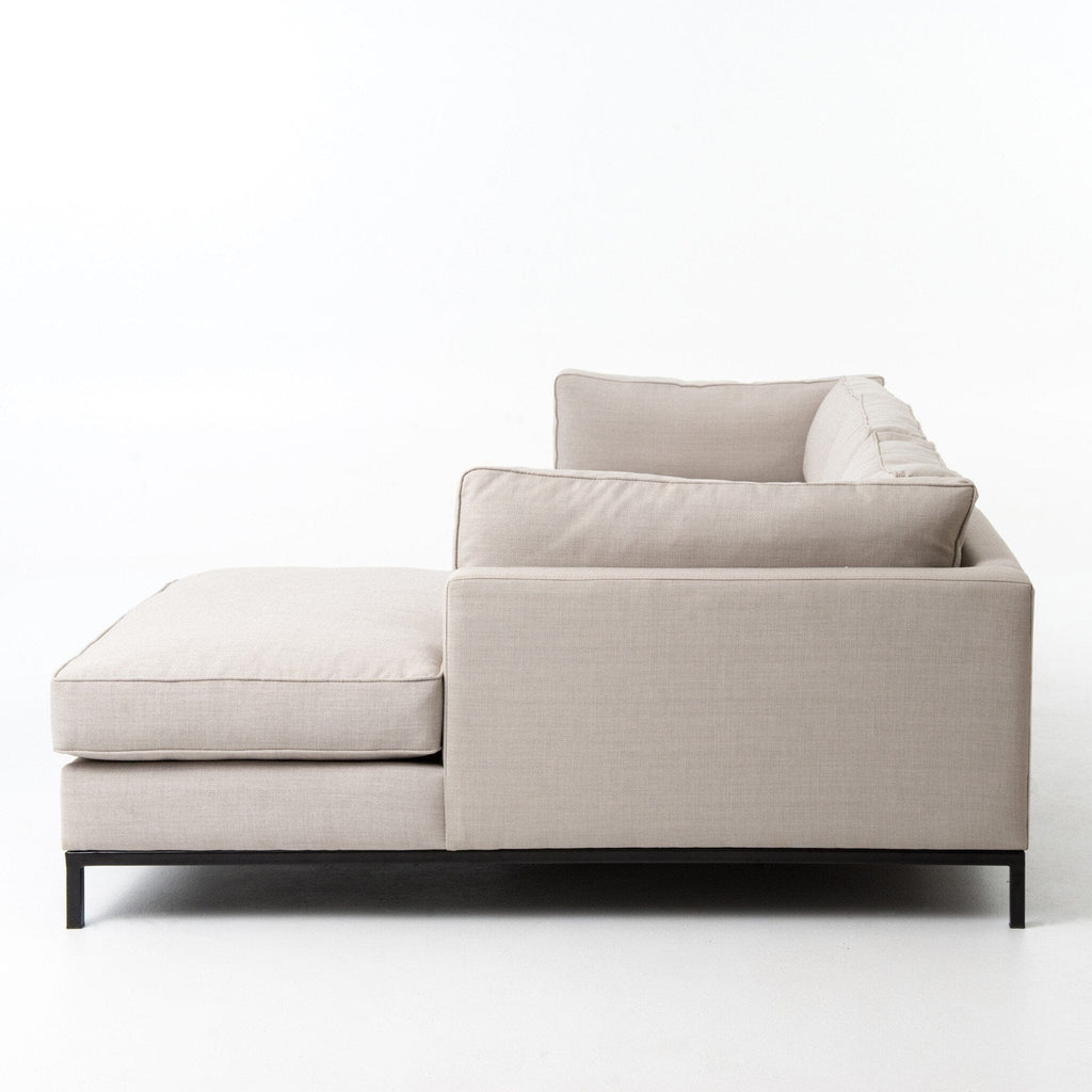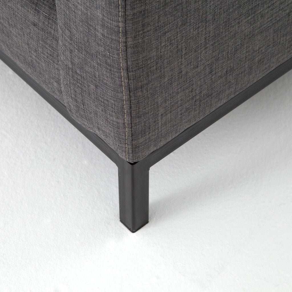The Darcy Sectional w/Left Chaise offers clean lines with a simple black iron base giving this piece a flexible style and luxurious comfort. The sofa and chaise are two pieces and clip together easily. Available in 2 fabric options; charcoal or light grey.