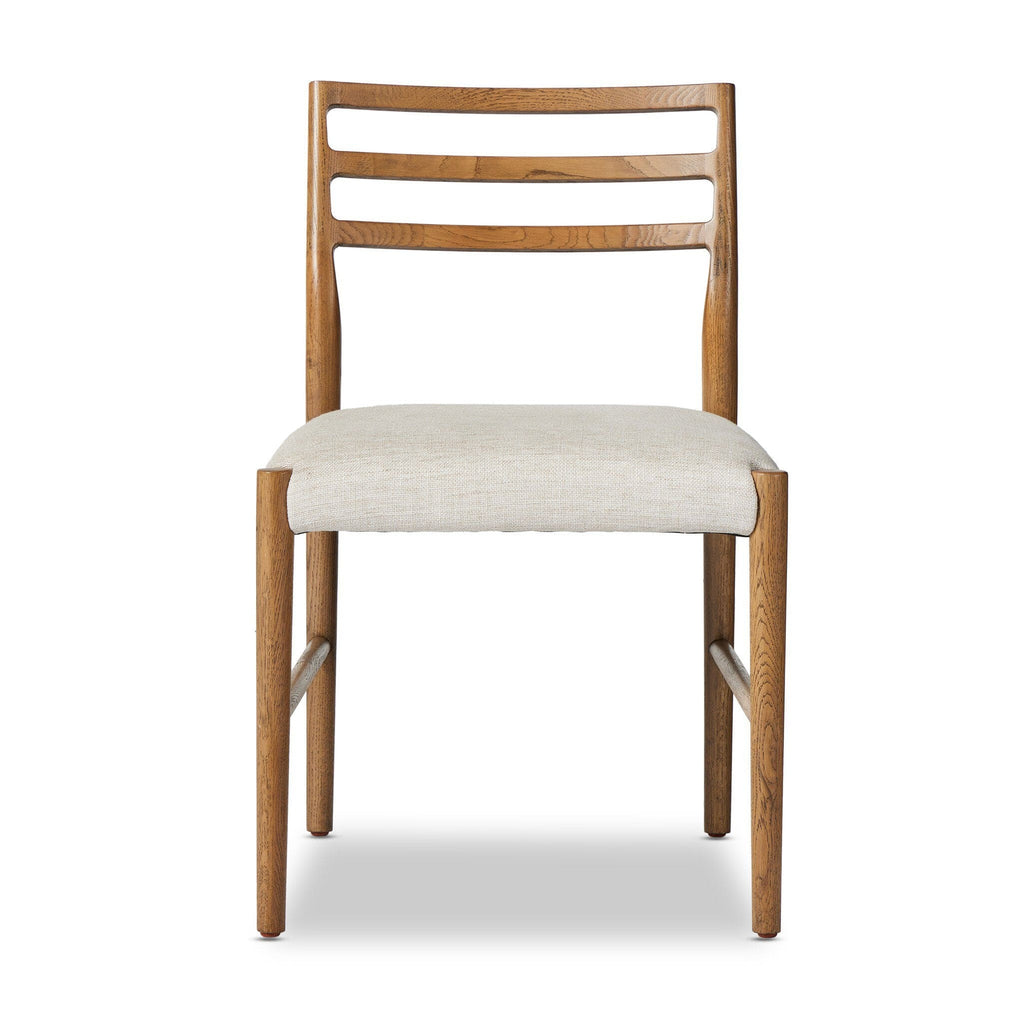 Carbon-toned seating blends cotton with linen for a textured feel and comfortable sitting. Fresh materials redefine the classic ladder-back chair. Scrubbed oak framing is finished in carbon for a clean, open look with natural depth.