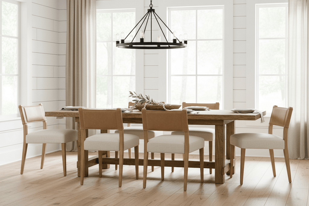 The Matthew Dining Chair has a unique contrast of materials with the brown wooden legs that are simple and framed. The grey performance seat is comfortable and pairs with the ebony top-grain leather back.