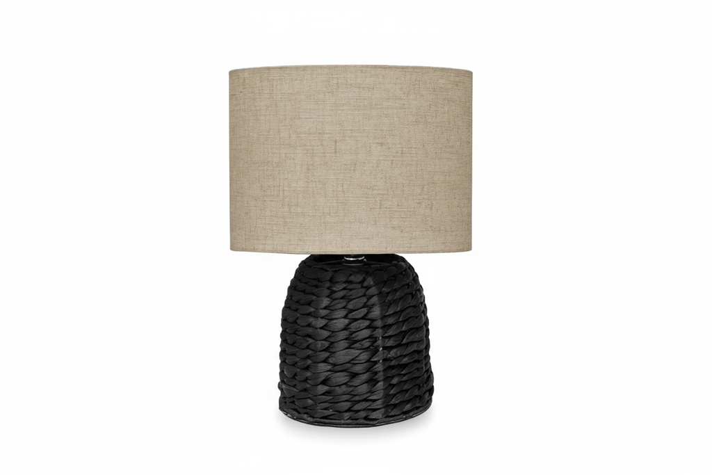 Black woven pattern formed from water hyacinth creates bold texture and contrast. Iron structure provides stability and definition. Crisp white linen shade balances the darker base with clean, diffused light. Mixed materials deliver strong visual impact with refined simplicity.