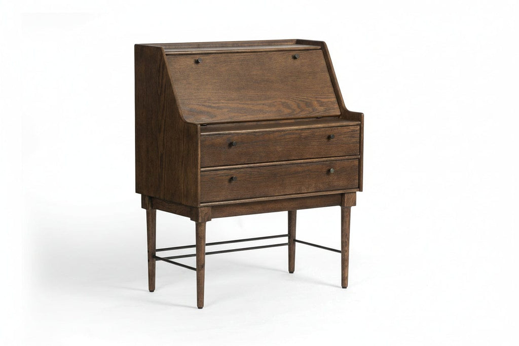 Solid oak construction finished in a rich walnut brown stain. Structured secretary design highlights precise craftsmanship and clean joinery. Vertical profile combines workspace functionality with refined presence. Natural wood grain adds depth and tonal warmth.