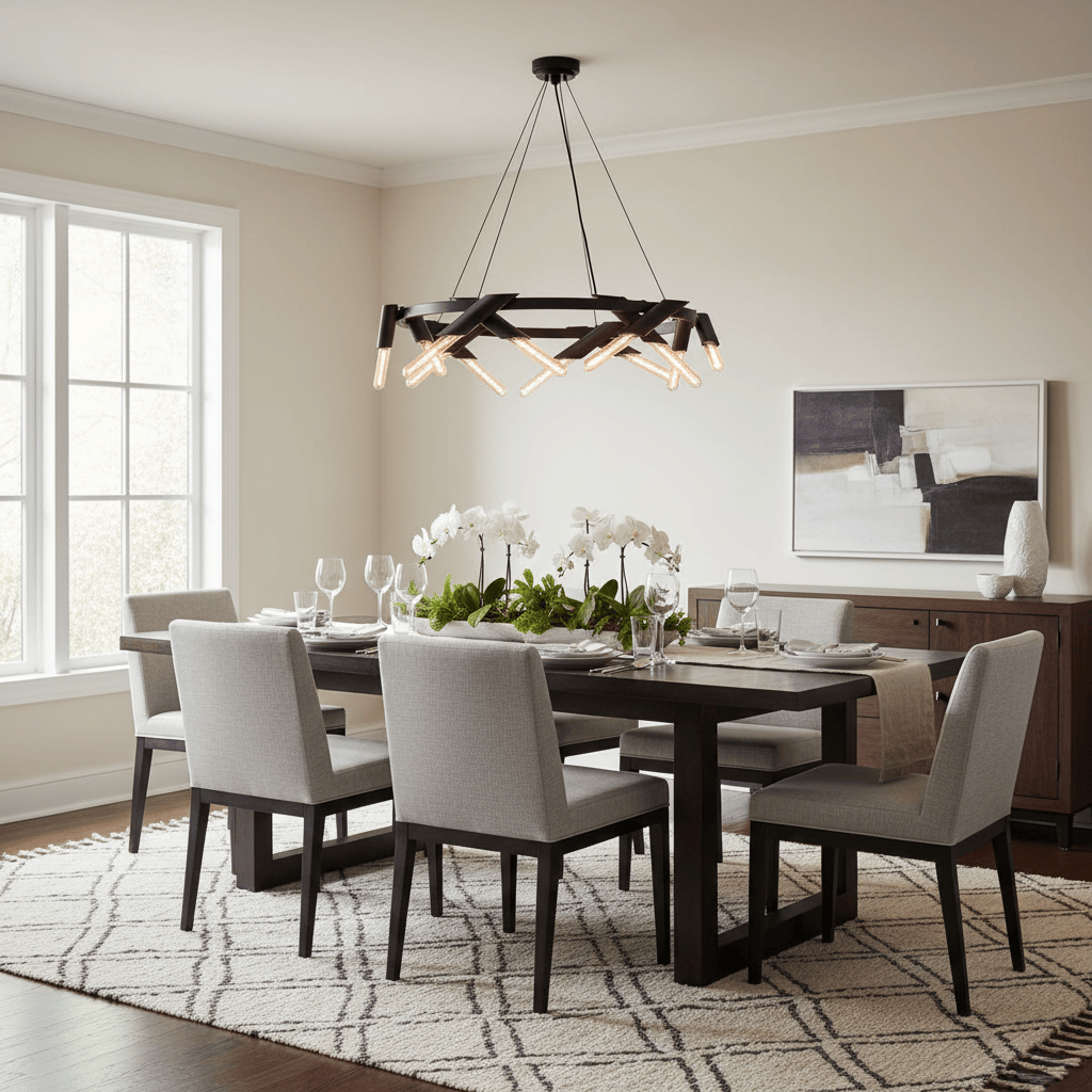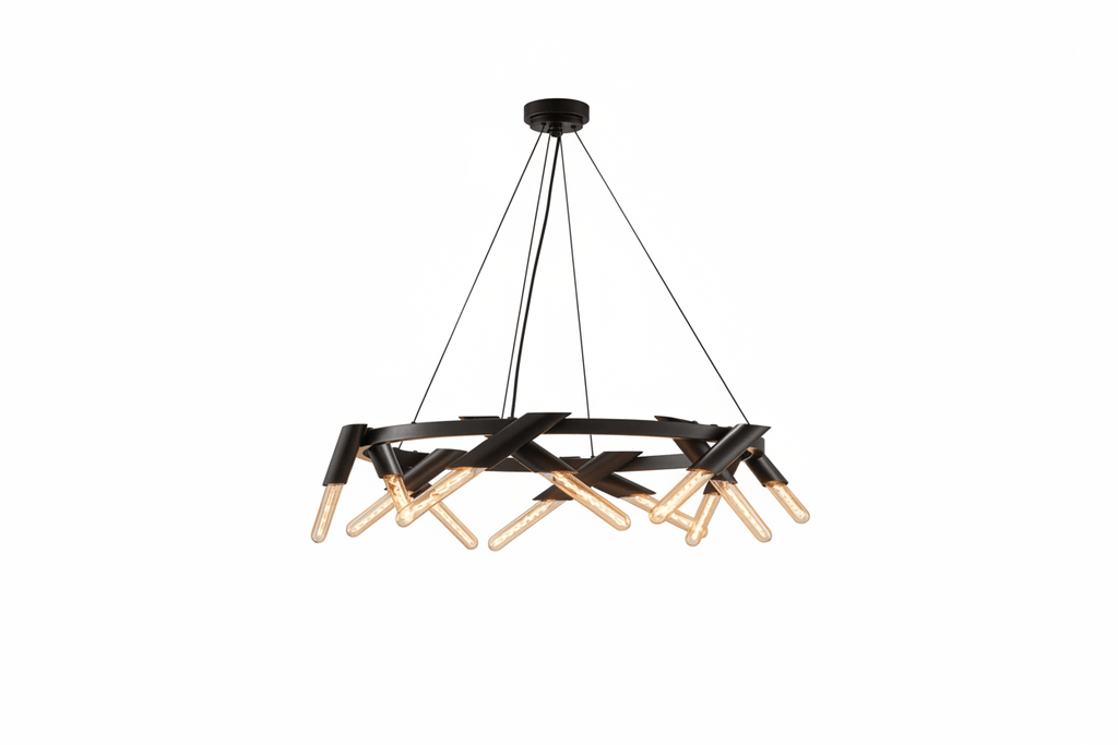 Circular chandelier featuring downward facing sockets arranged in a structured ring. Accommodates twelve T tubular bulbs at 25 watts each. Adjustable hanging height from 36 to 60 inches. Includes a 13 foot cord for flexible installation. Bulbs not included.