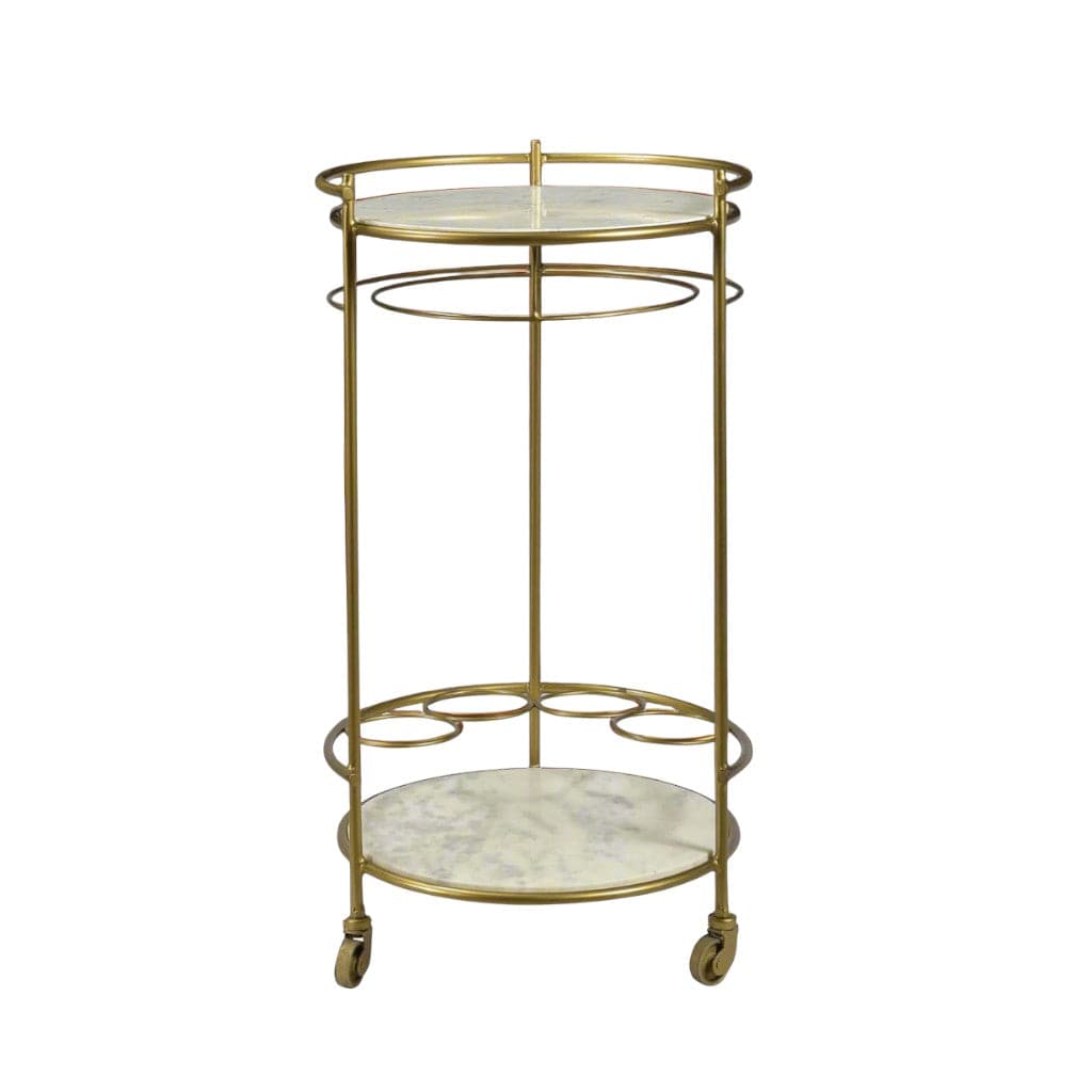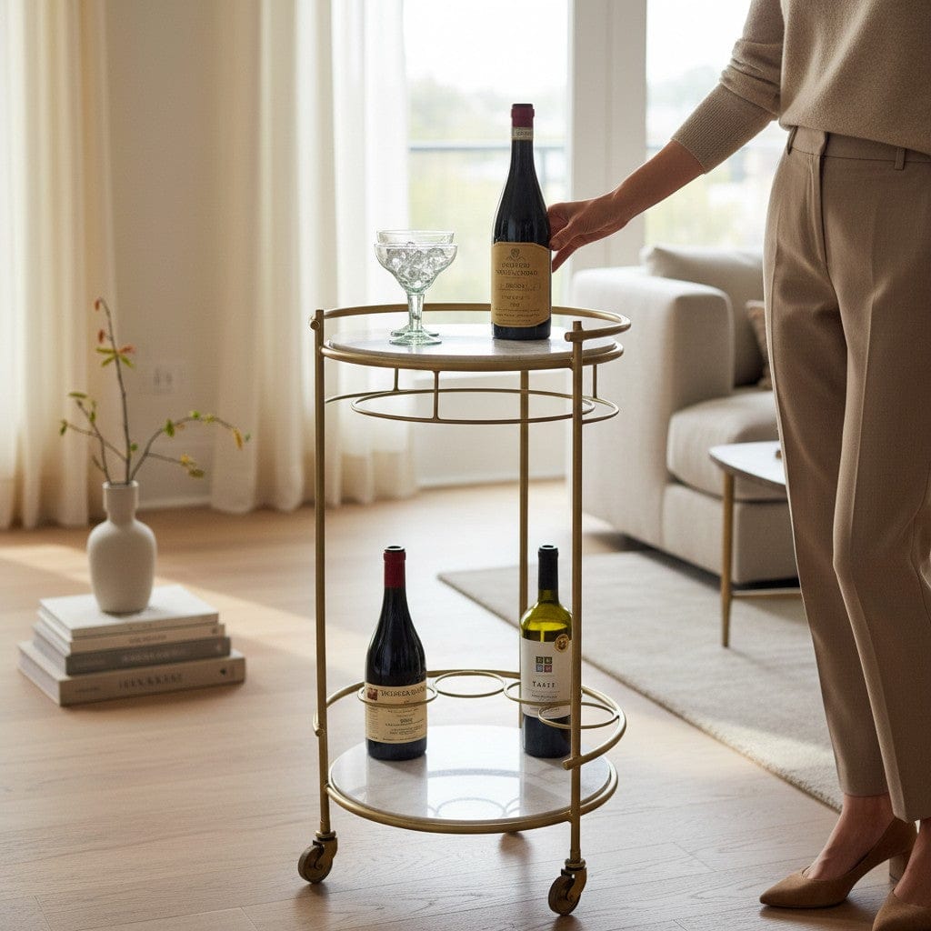 The Yarrow Bar Cart combines elegance and mobility with its circular antique brass frame and two 17” banswara marble shelves. The bottom shelf includes four bottle slots for secure storage, while caster wheels allow easy movement and locking in place. Ideal for entertaining, use the bottom tier for storage and the top for serving in style.