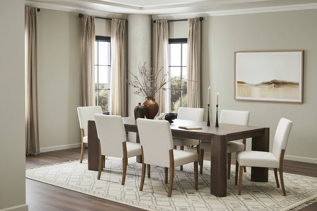 Heavy proportions and angled, over scaled legs define this Parsons style dining table. Crafted from reclaimed wood, the surface is finished in an aged natural oak stain that highlights natural cracks, knots, and patches. The result is a richly textured piece with distinctive character and enduring presence.
