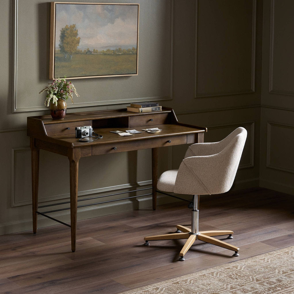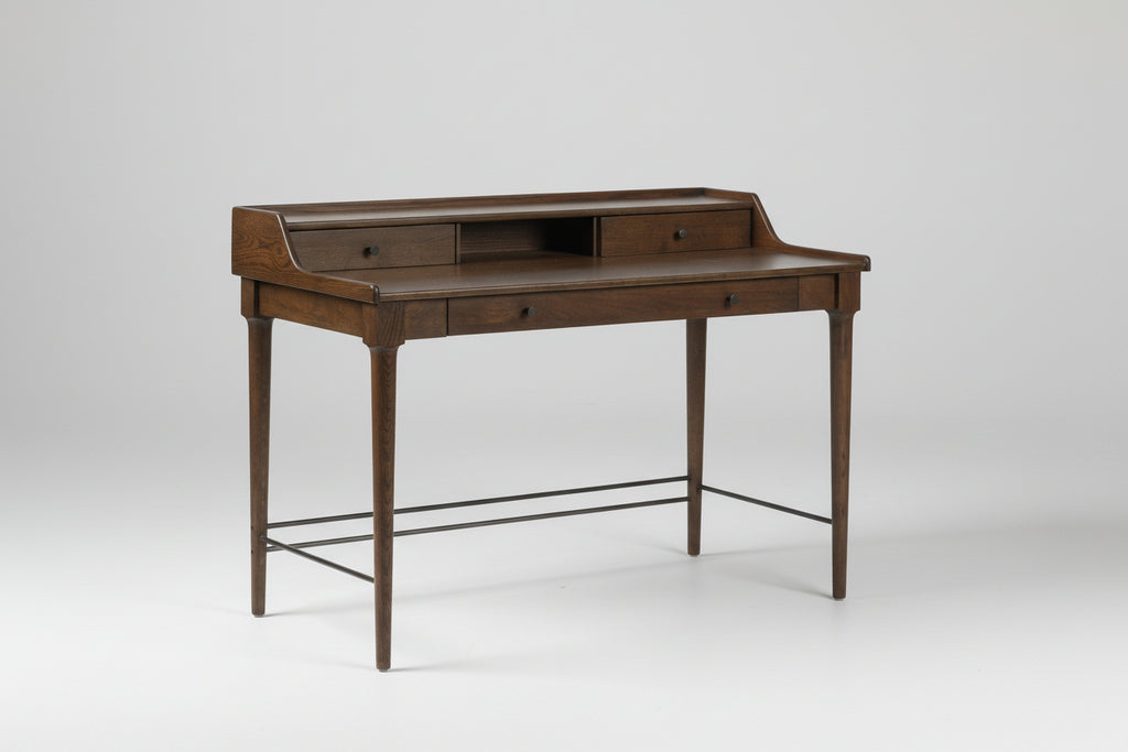 Simple beauty defines this refreshed writing desk, where timeless design meets everyday function. The dark toasted oak finish showcases rich brown undertones inspired by classic mid century design, bringing warmth and depth to any workspace. Clean lines and a well balanced silhouette create a refined presence, while ample integrated storage keeps work essentials organized and easily accessible, making it an ideal piece for a modern home office.