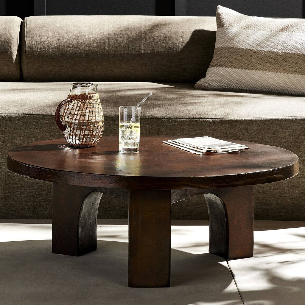 With bold, sculptural contours, the Iman Coffee Table introduces a modern, artful presence to any setting, indoors or out. Subtle swirls of color enhance its antique rust finish, while the tiered silhouette creates a sense of movement. Suitable for outdoor use—simply cover or store inside during harsh weather or when not in use.