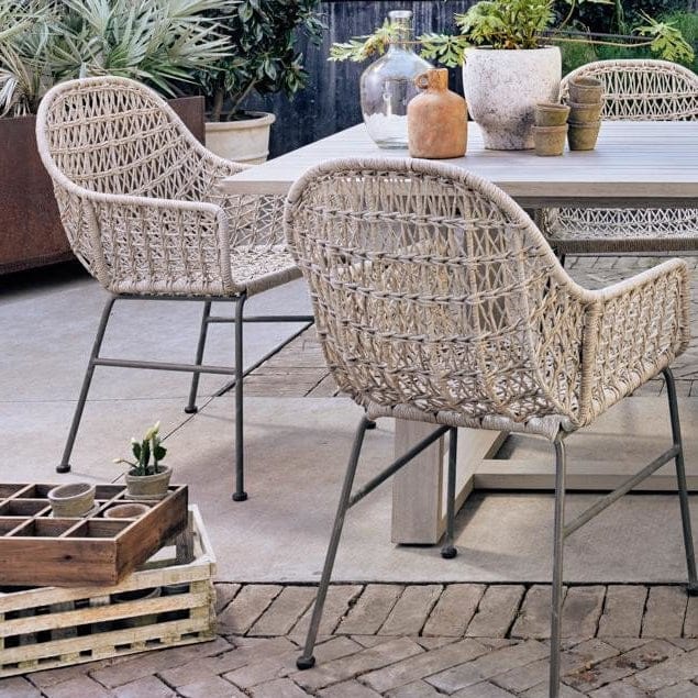 The Perry Dining Chair with fresh, contemporary lines and a refined woven design bring a modern edge to white all-weather wicker. A low-profile seat rests on a contrasting bronze iron base for a balanced, airy look. For longevity, cover or store indoors during harsh weather or when not in use.