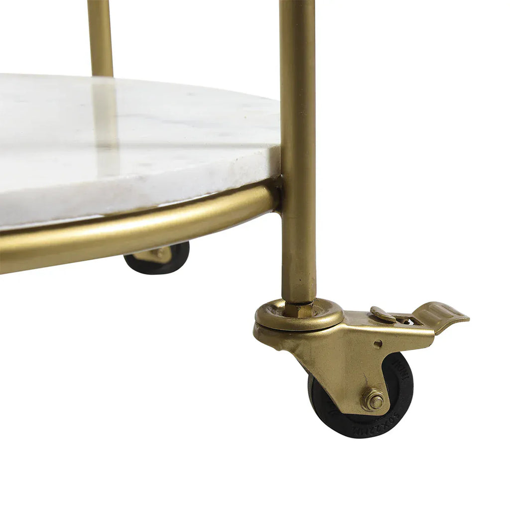 The Shofia Bar Cart is a versatile and elegant piece featuring locking wheels, built-in wine glass storage, and two tiers for spirits or barware. Crafted from solid brass with a muted gold patina, it pairs a marble lower shelf with a glass upper shelf for a lighter, refined look. Perfect for small spaces or as a statement piece.