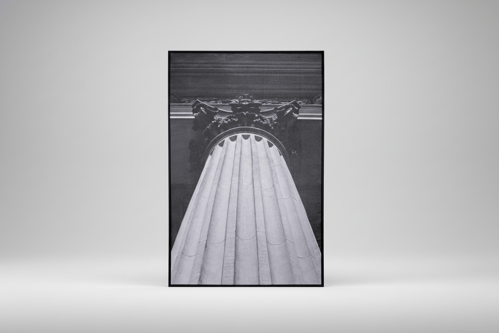 Black and white canvas photograph captured from a low vantage point, emphasizing the vertical scale and detail of a Corinthian style column in historic Montreal. Architectural lines and shadow contrast highlight classical form. Presented in a black finished wood floater frame for a clean, gallery style display.