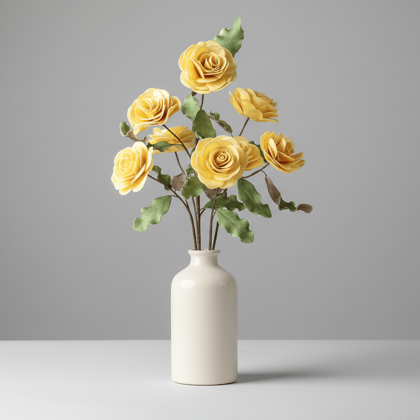 Soft yellow and peach toned EVA foam petals form a layered rose bloom. Flexible green leaves and a brown stem with internal wiring allow shaping and repositioning. Designed for styled arrangements in decorative vases.