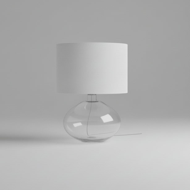 Clear handblown glass base paired with a crisp white cotton shade. Transparent form and clean silhouette create an airy, balanced profile. Subtle materials and restrained proportions deliver a timeless lighting accent.