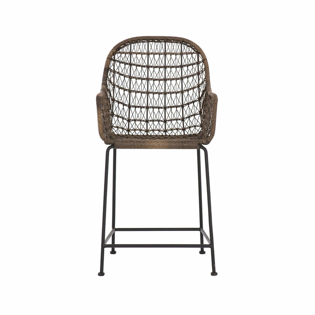 The Perry Outdoor Bar + Counter Stool is made of all-weather wicker that is pieced together beautifully for a farmhouse yet rustic style. Features contrasting slim black iron frame with footrest.