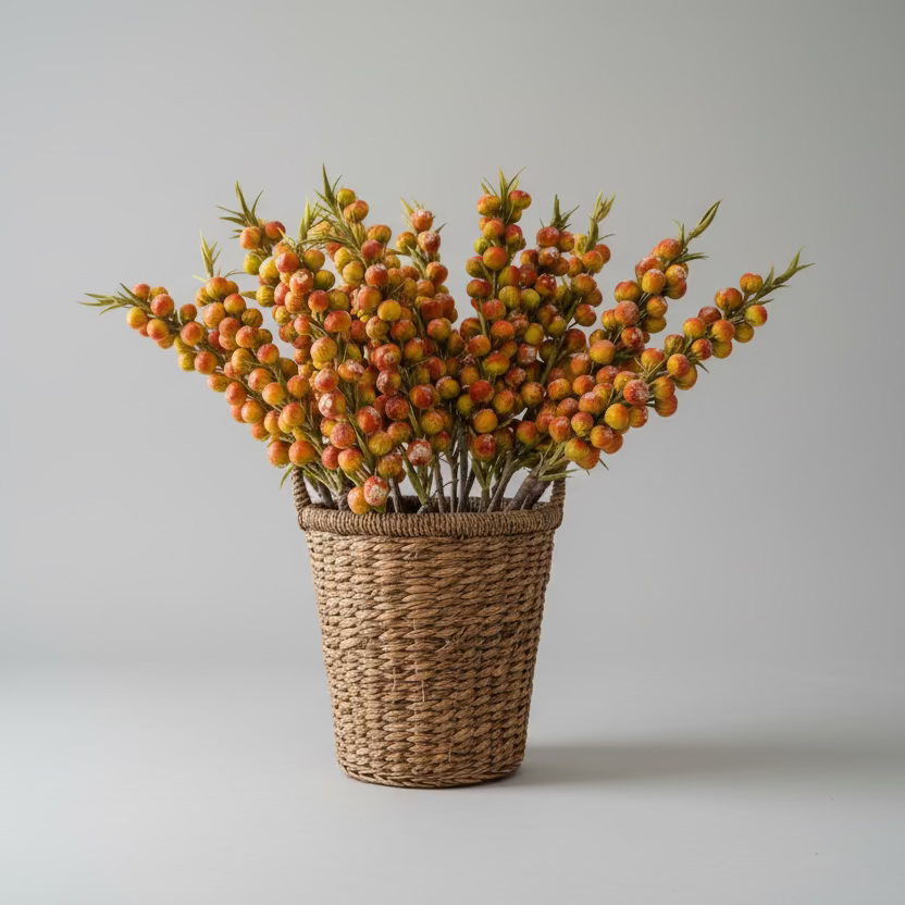 A tall botanical stem featuring tightly wired red and mustard toned bulbs layered along a structured central branch. Varied color saturation and clustered placement create dimension, texture, and vertical height. Designed to add contrast and warmth to arrangements or to be grouped in multiples for a clean, sculptural display.