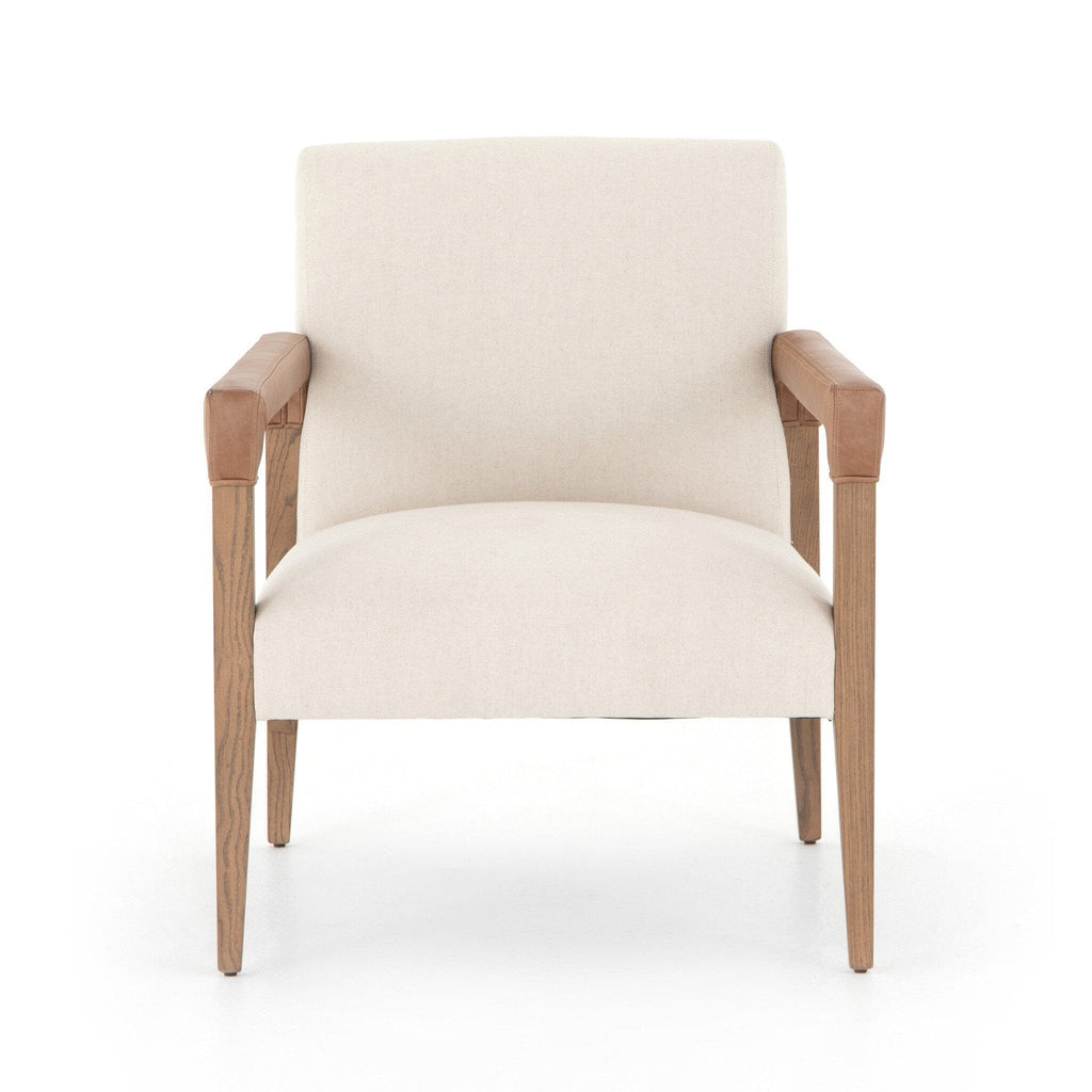 The Serena Chair is elegant and modern with a sleek oak wood frame with arms wrapped in top-grain leather that compliments the cotton floating seat. Also available in dining chair option.