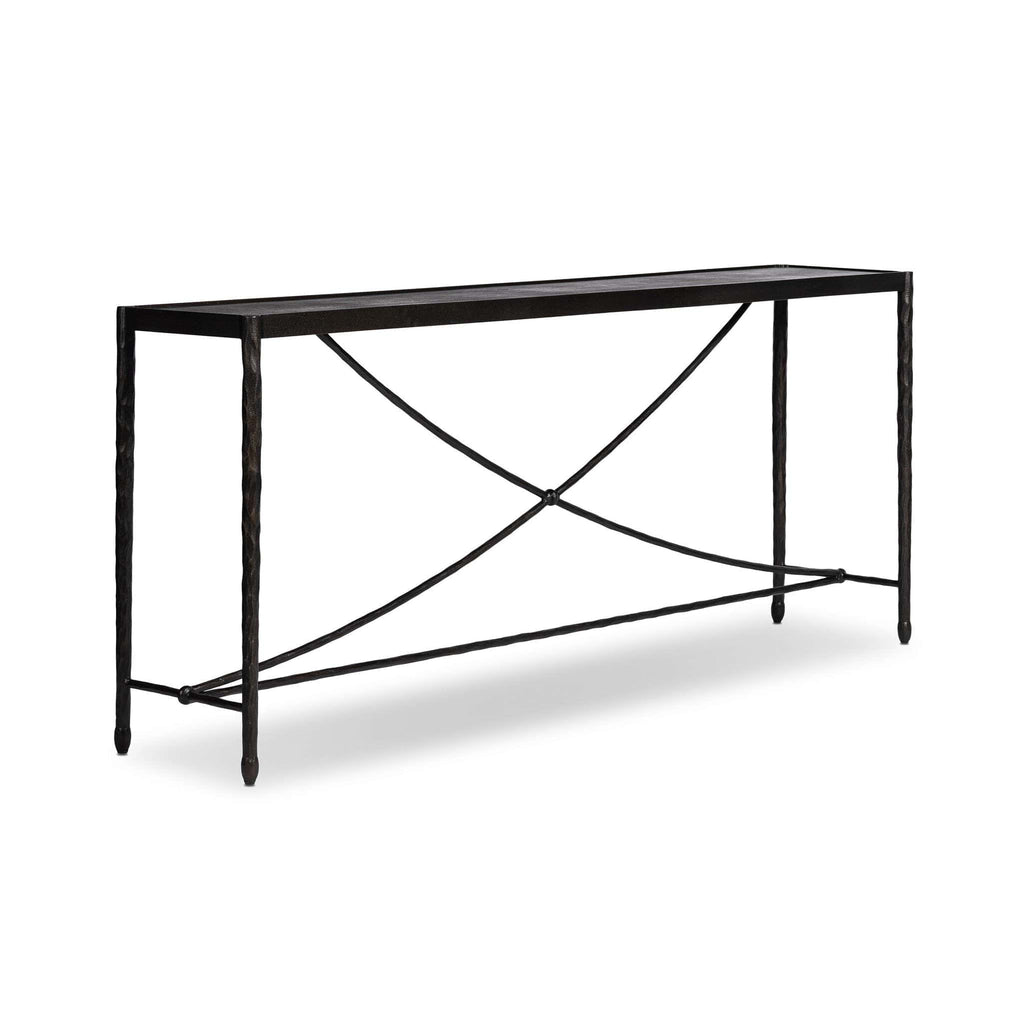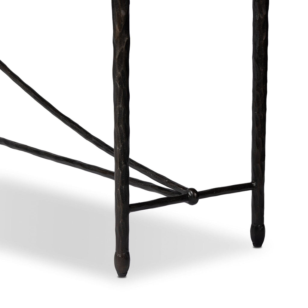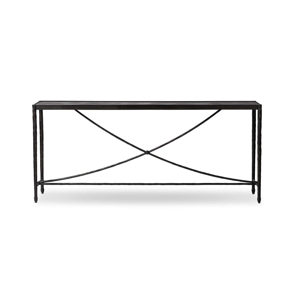 Channeling Art Deco style, this piece features a curved stretcher base crafted from bronzed, hammered iron. Ideal for an entryway, media room, or any space in need of added storage or display.